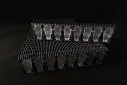 Кюветы из прозрачного пластика с двумя отверстиями для дозирования пробы и реагента, с ребристым краем для захвата шестеренками автоподатчика
