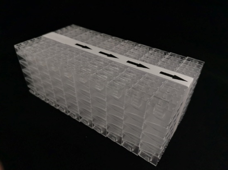 Блок кювет (4*100) опоясан бумажной лентой со стрелками, указывающими направление помещения блока кювет в измерительную зону анализатора.