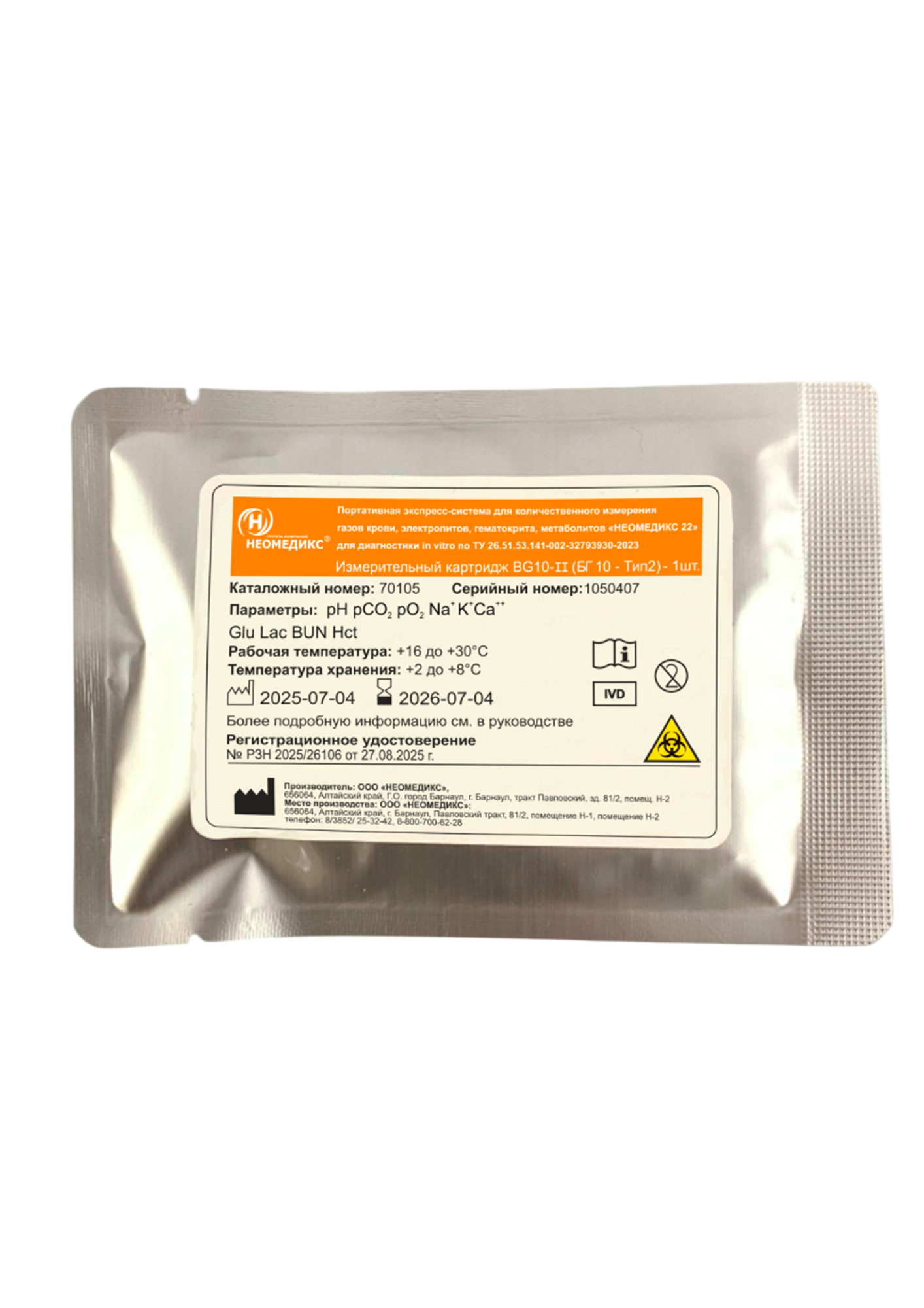 Картридж: БГ 10-ТИП 2(BG10-2) — измерительный картридж для анализатора газов крови "НЕОМЕДИКС 22"