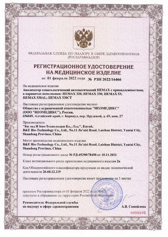 ООО «НЕОМЕДИКС» является уполномоченным представителем B&E Bio-Technology Co., Ltd – китайского производителя гематологических анализаторов HEMAX в России (Регистрационное удостоверение РУ № 2022/16466 от 1 февраля 2022), а также российским производителем реагентов для анализаторов HEMAX (Регистрационное удостоверение РУ № 2020/13168 от 20 сентября 2024).
